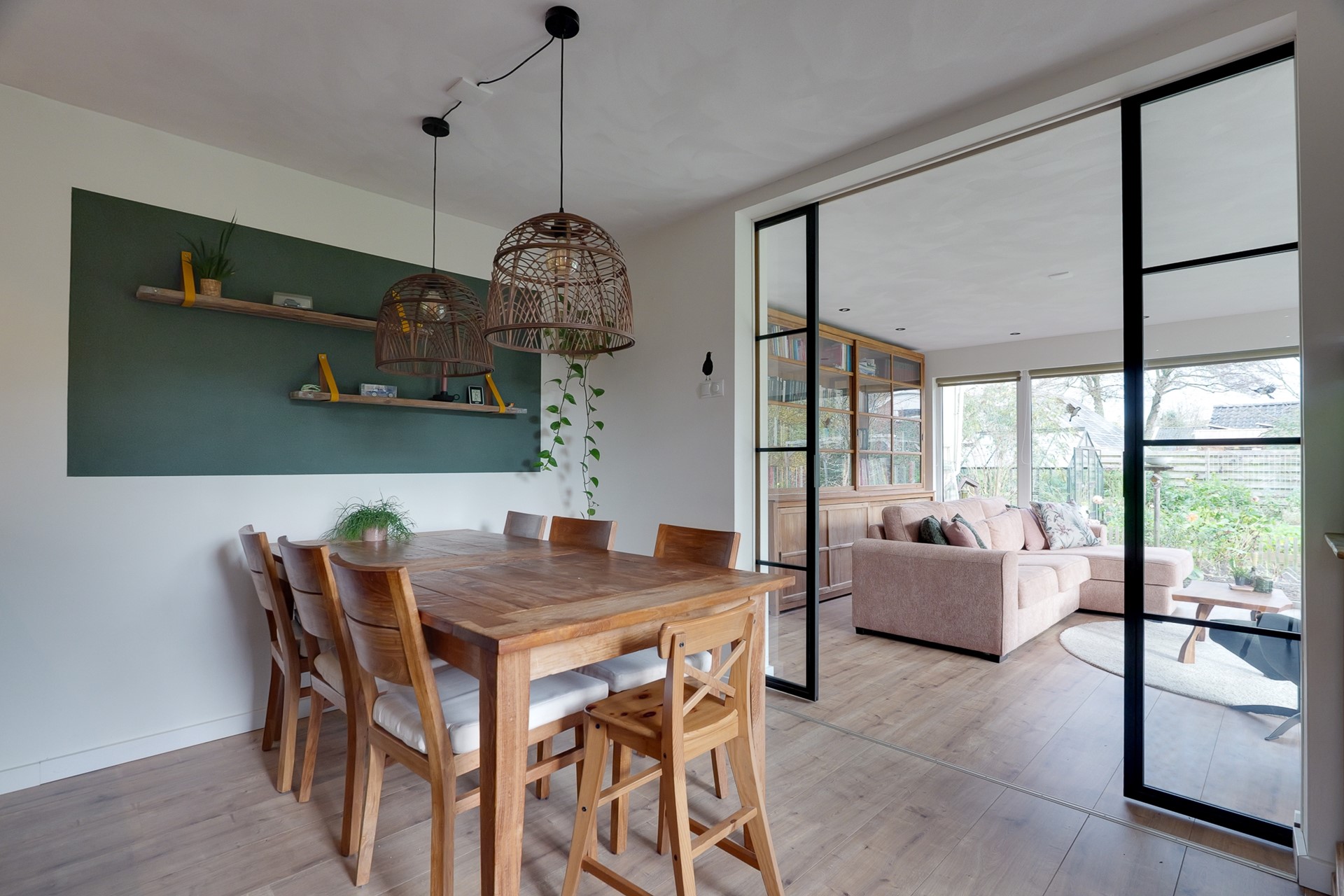 De woning beschikt over een zeer ruime open living van ruim 80m2 bestaande uit een sfeervolle woonkamer, een grote eetkeuken en een aangrenzende tuinkamer. De woonkamer heeft een bijzonder prettige lichtinval, een houtkachel en een gezellig erker. Vanuit de woonkamer is de kelder bereikbaar. In de aangrenzende grote woonkeuken, welke van alle gemakken is voorzien, kunnen kookliefhebbers hun hart ophalen. Het is een heerlijke plek om uitgebreid te koken en lekker lang te tafelen. Via stalen schuifdeuren stapt men de zeer royale tuinkamer binnen waar men een schitterend zicht heeft op de tuin. De aanwezigheid van een grote schuifpui zorgt ervoor dat er een directe verbinding tussen de tuin en de kamer kan worden gecreëerd. Aansluitend aan de tuinkamer bevindt zich een riante hal met volop mogelijkheden tot het creëren van opbergruimte. Vanuit de hal bereikt men de bijkeuken (ca. 13m2) gesitueerd in de garage. De woning kan levensloopbestendig worden gemaakt door in de bijkeuken een badkamer te realiseren en de tuinkamer te transformeren naar een slaapkamer.
