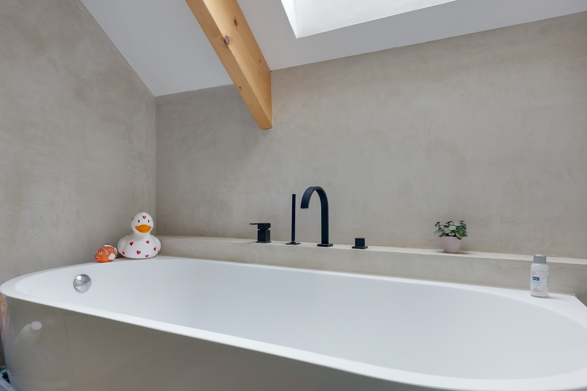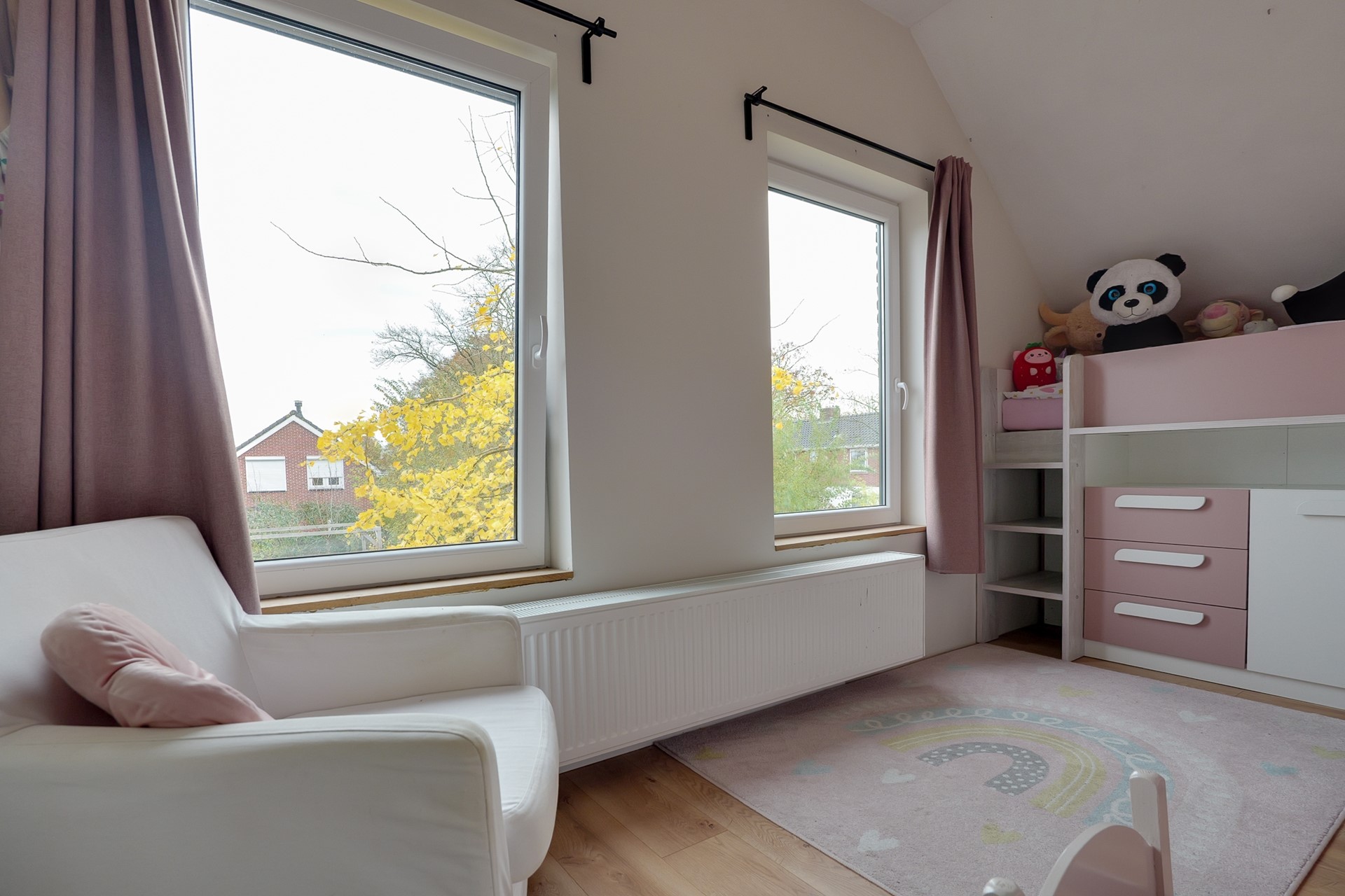 Op de verdieping bevinden zich drie sfeervolle slaapkamers waarvan de grootste slaapkamer is voorzien van vaste kastruimte. De derde slaapkamer is bereikbaar via een royale kamer (ca. 12m2) welke uitstekend dienst kan doen als kantoor of thuiswerkplek. Bovendien vinden we op deze verdieping een moderne badkamer, voorzien van betonstuc met ruime douchecabine, tweede toilet, ligbad en badmeubel met dubbele waskom. Op de ruime overloop is toegang tot een inbouwkast met de witgoedopstelling en de CV-ketel.