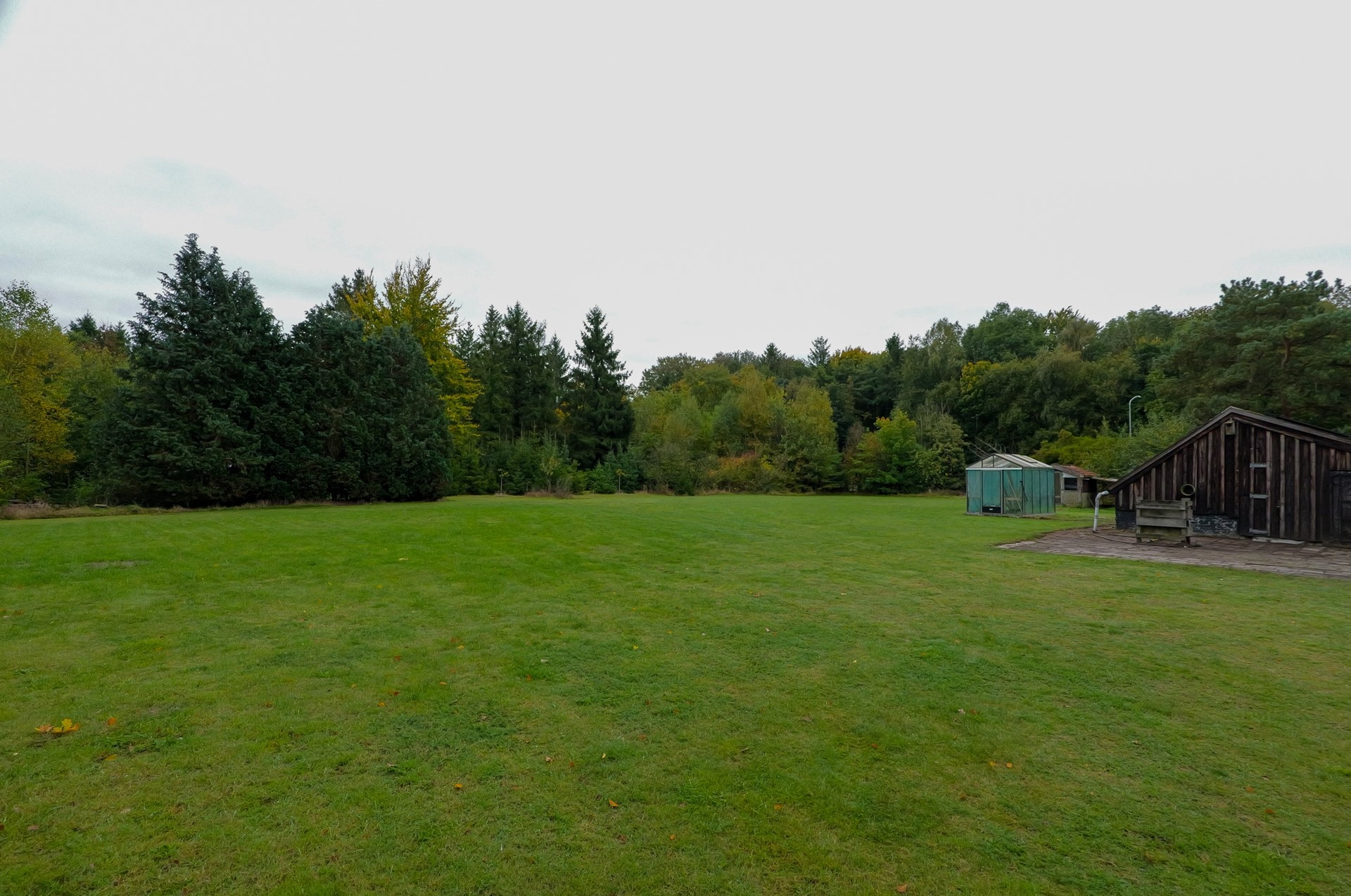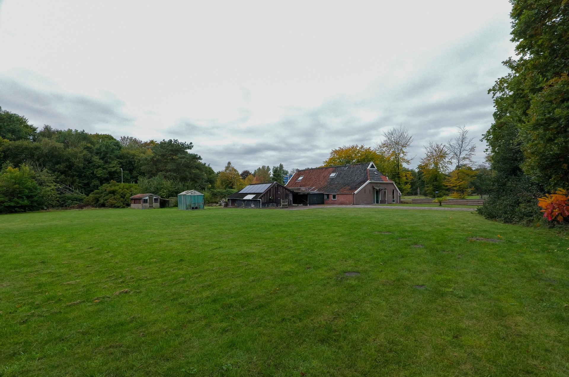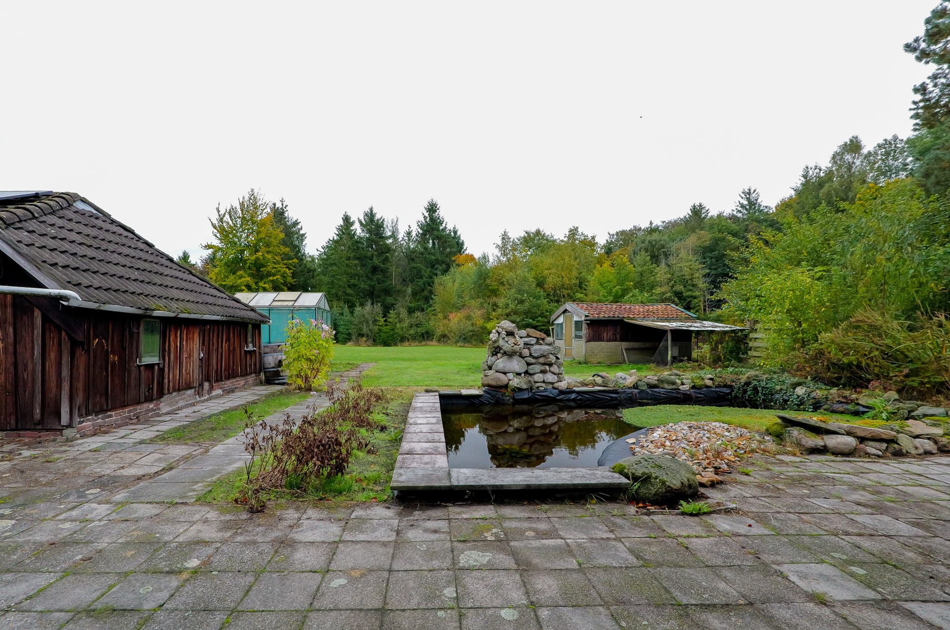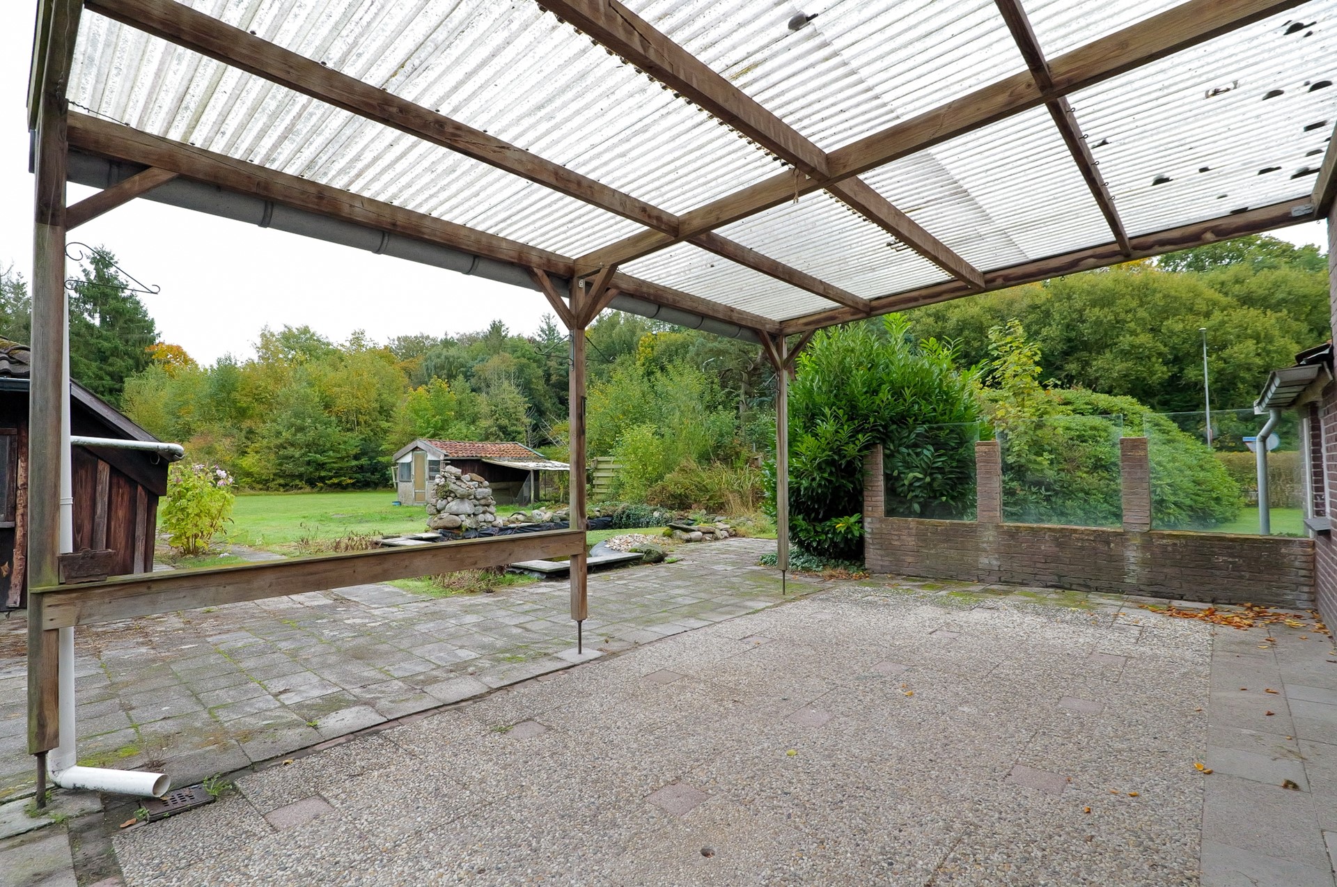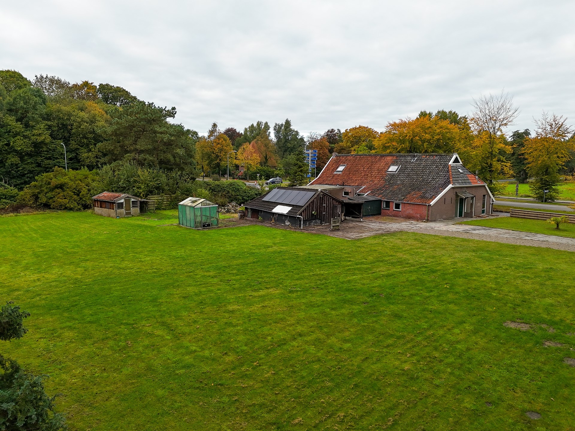 Tegen de gevel, aan de tuinzijde, is boven de openslaande deuren een overkapping bevestigd van ca. 21m2. Je geniet hier van het uitzicht op de tuin, het grasland, de vijver, de ruimte en de privacy. Op het perceel staat vlakbij de woning een houten schuur ca. 34m2met carport, iets verder van de woning staan een kippenhok, een houtopslagplaats en een ruime overkapping – perfect als opslagruimte of hobbyplek. Gezien de perceelgrootte en de ligging van het huis op het perceel biedt de grasweide de mogelijkheid voor het houden van paarden.