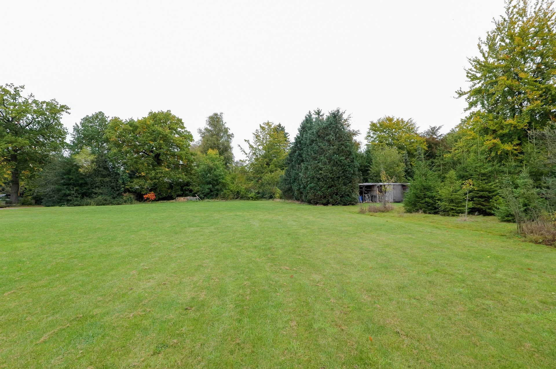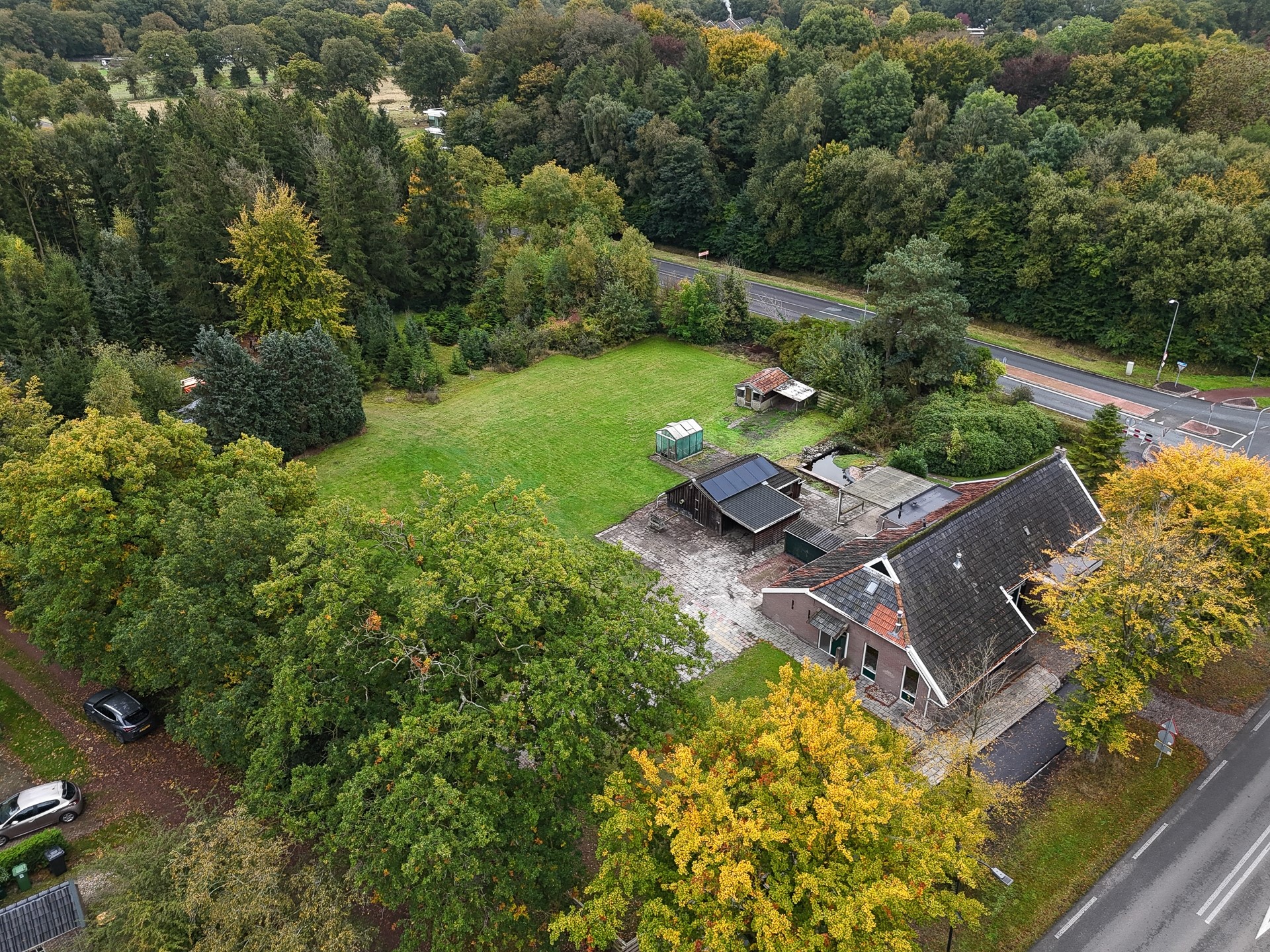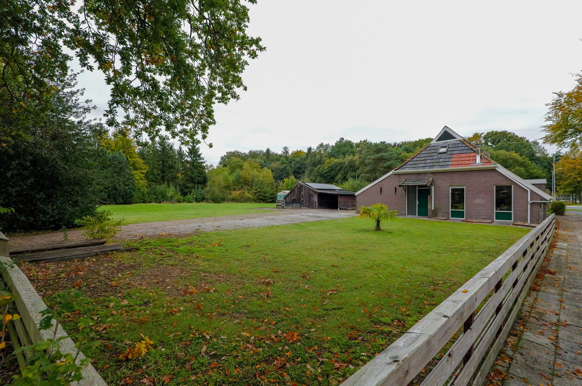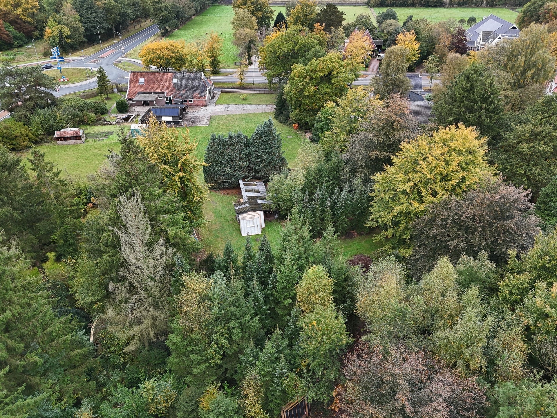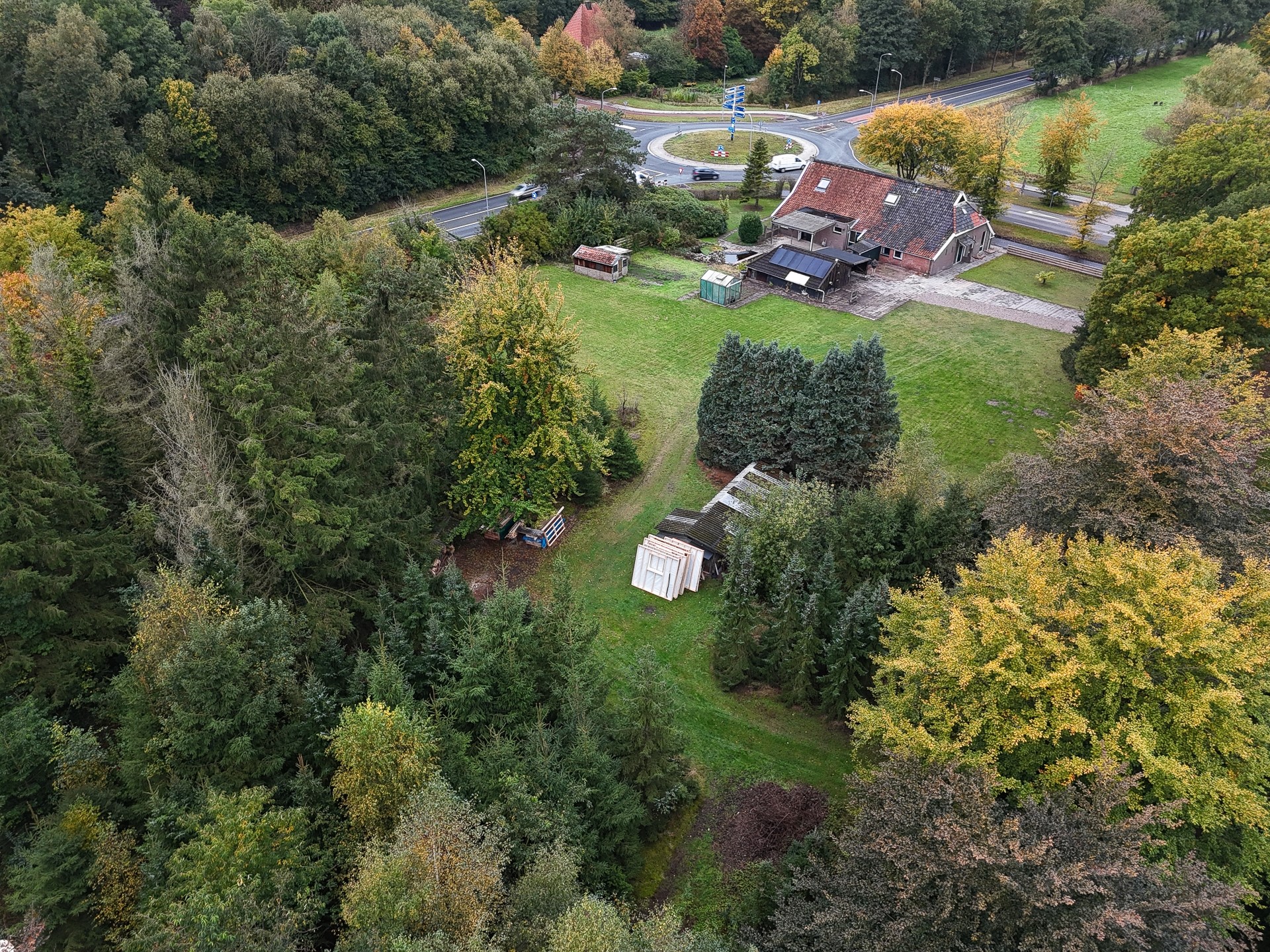 Tegen de gevel, aan de tuinzijde, is boven de openslaande deuren een overkapping bevestigd van ca. 21m2. Je geniet hier van het uitzicht op de tuin, het grasland, de vijver, de ruimte en de privacy. Op het perceel staat vlakbij de woning een houten schuur ca. 34m2met carport, iets verder van de woning staan een kippenhok, een houtopslagplaats en een ruime overkapping – perfect als opslagruimte of hobbyplek. Gezien de perceelgrootte en de ligging van het huis op het perceel biedt de grasweide de mogelijkheid voor het houden van paarden.